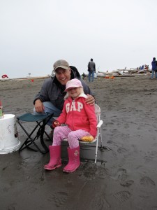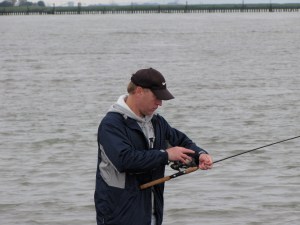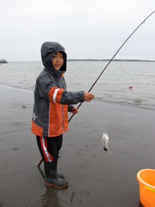Derek being taught to fish by his daughter.