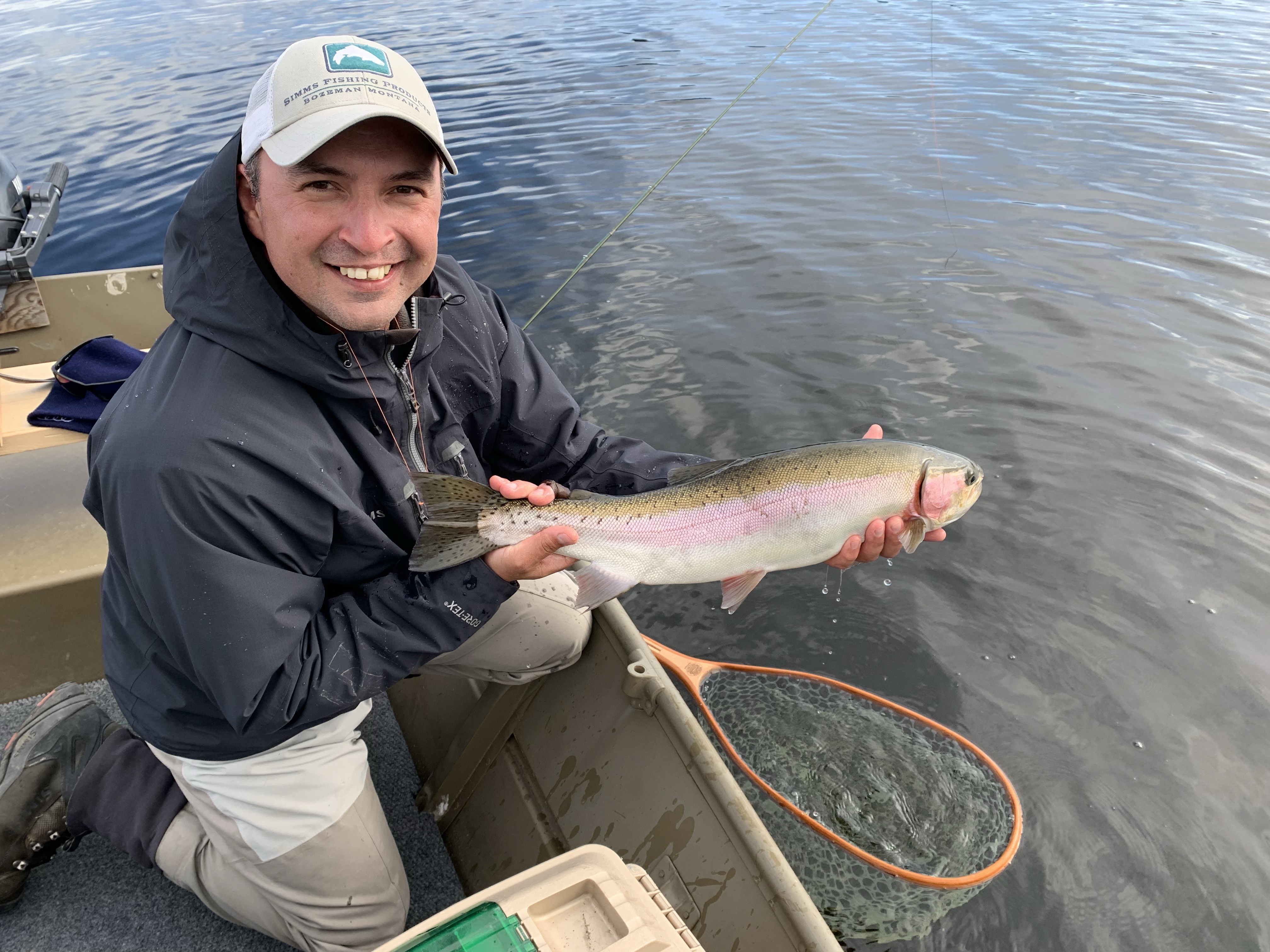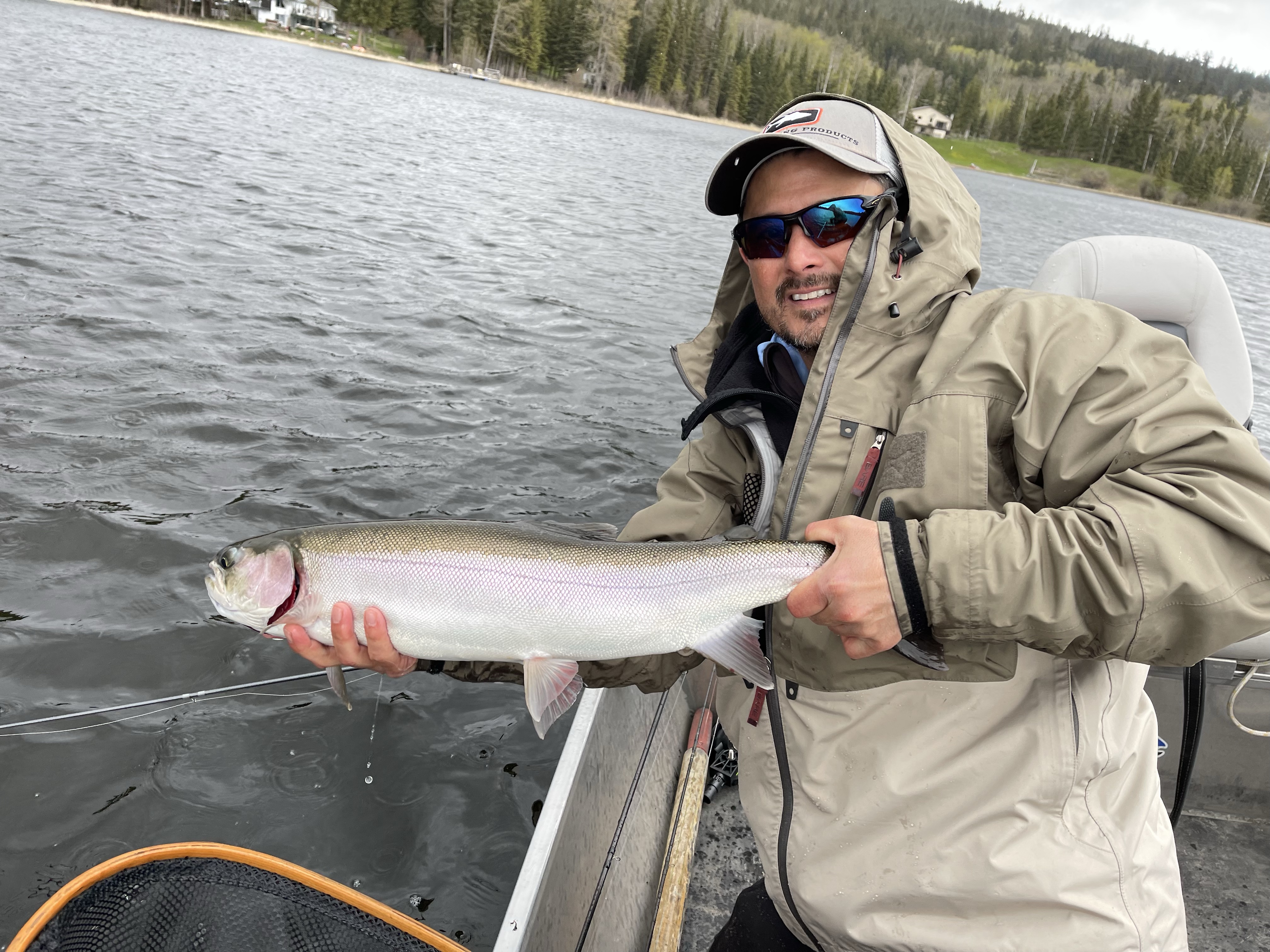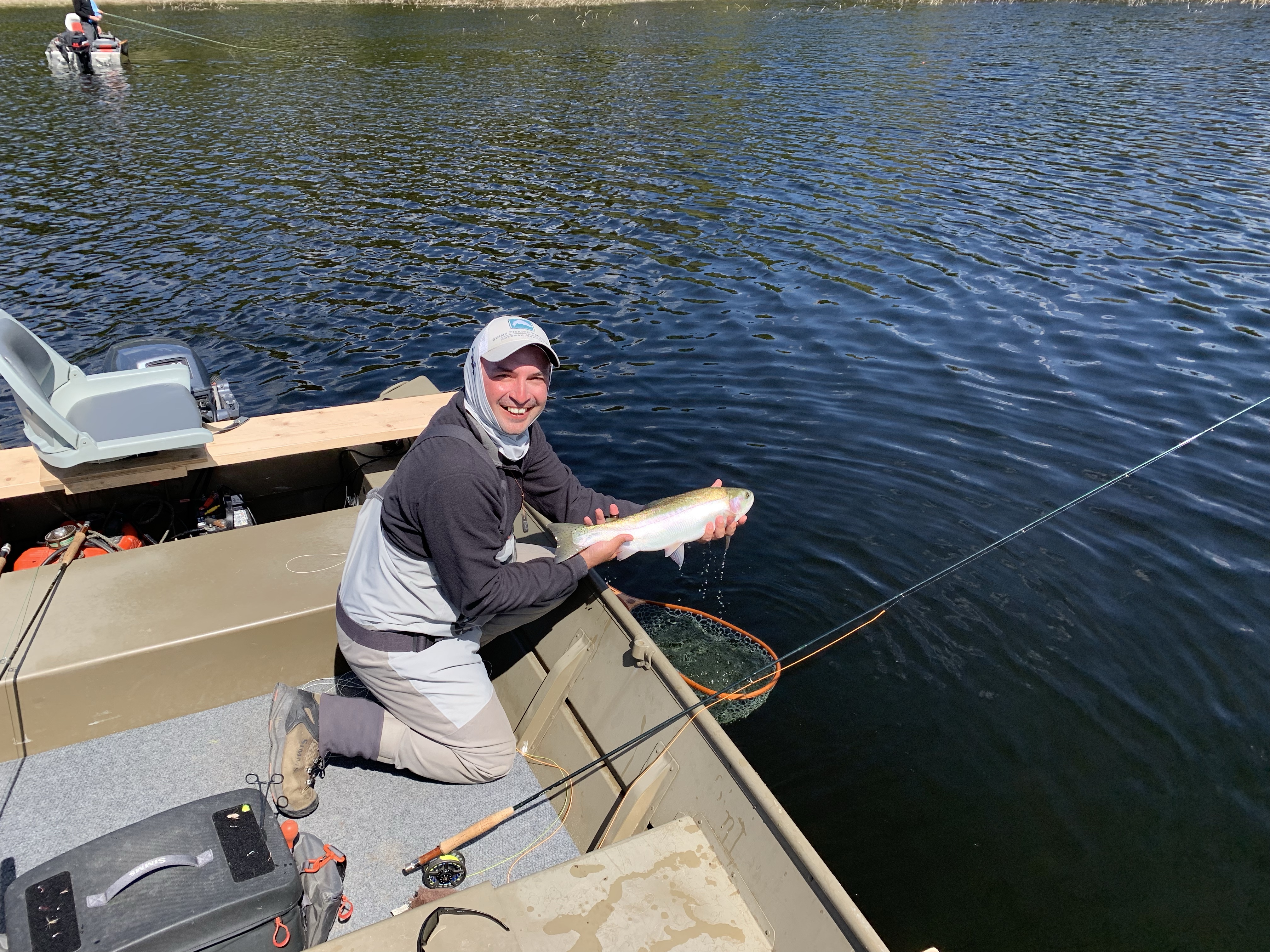 Falling in lake story- so as u can see there are big fish in these lakes. While chironomiding with my new custom Able and new linear 10/4 rod I took a break to do something and put my rod between my legs. Just as I did I feel my rod move and all of a sudden I see my rod in the air! With my cat like reflexes I went to grab my rod with one hand in gunnel and one leg bracing myself under the non secured seat. In a flash I feel my self summersaulting off the seat and rolling right into the lake. While in the lake and holding on to the boat I have to make a quick decision to swim for bobbing rod or get back into the boat. Since I was wearing waders I decided to get back into the boat. For about five minutes we see the fish jumping with the line and rod still attached and it looks to be a 3-4 lb rainbow. After removing my wet clothes I come to the realization that my set up is gone. Fifteen minutes later a guy yells he found a rod as it was bobbing by his boat. Thinking it was his rod because he had the same rod he grabs it and plays the fish that is still hooked.