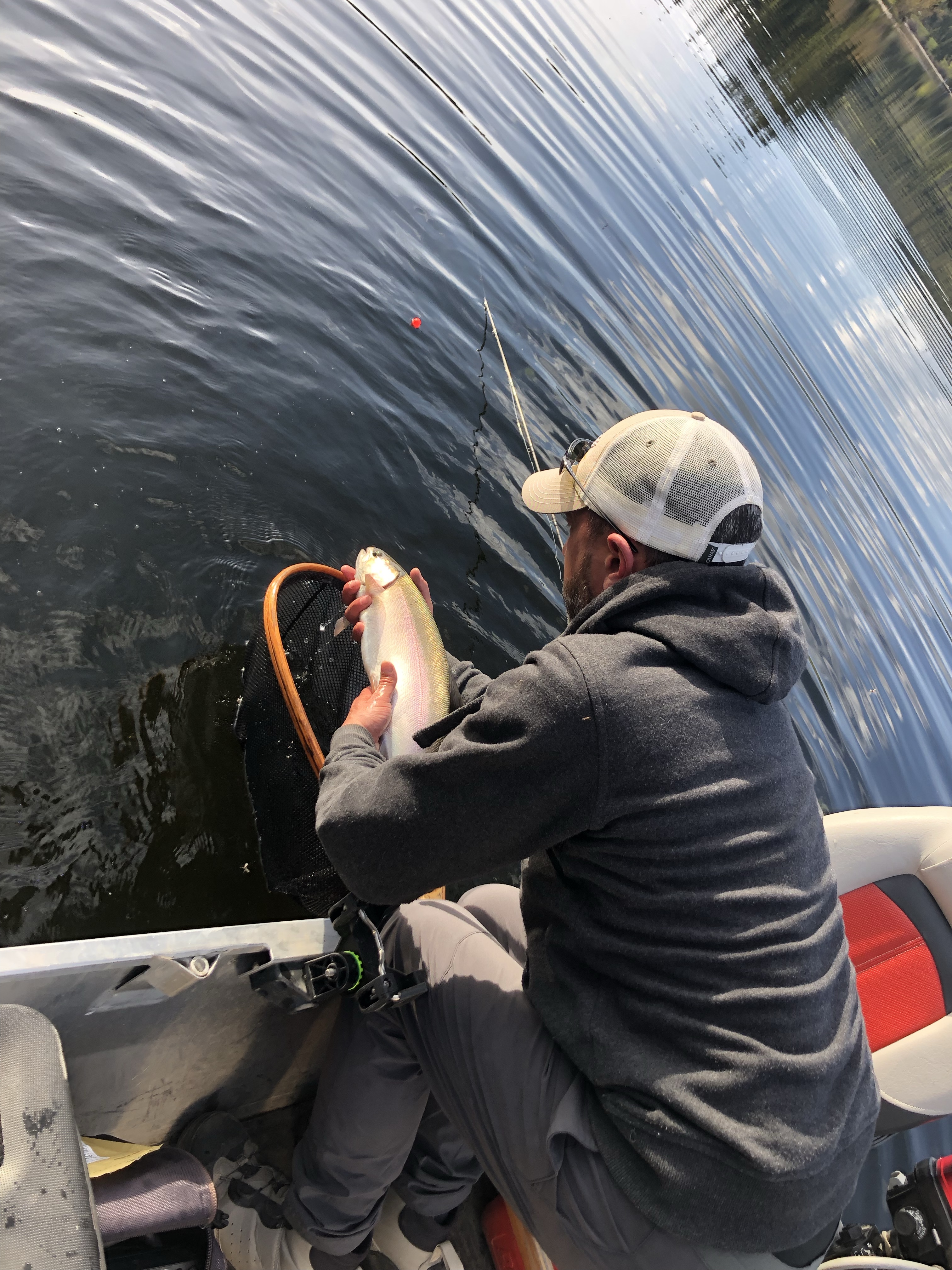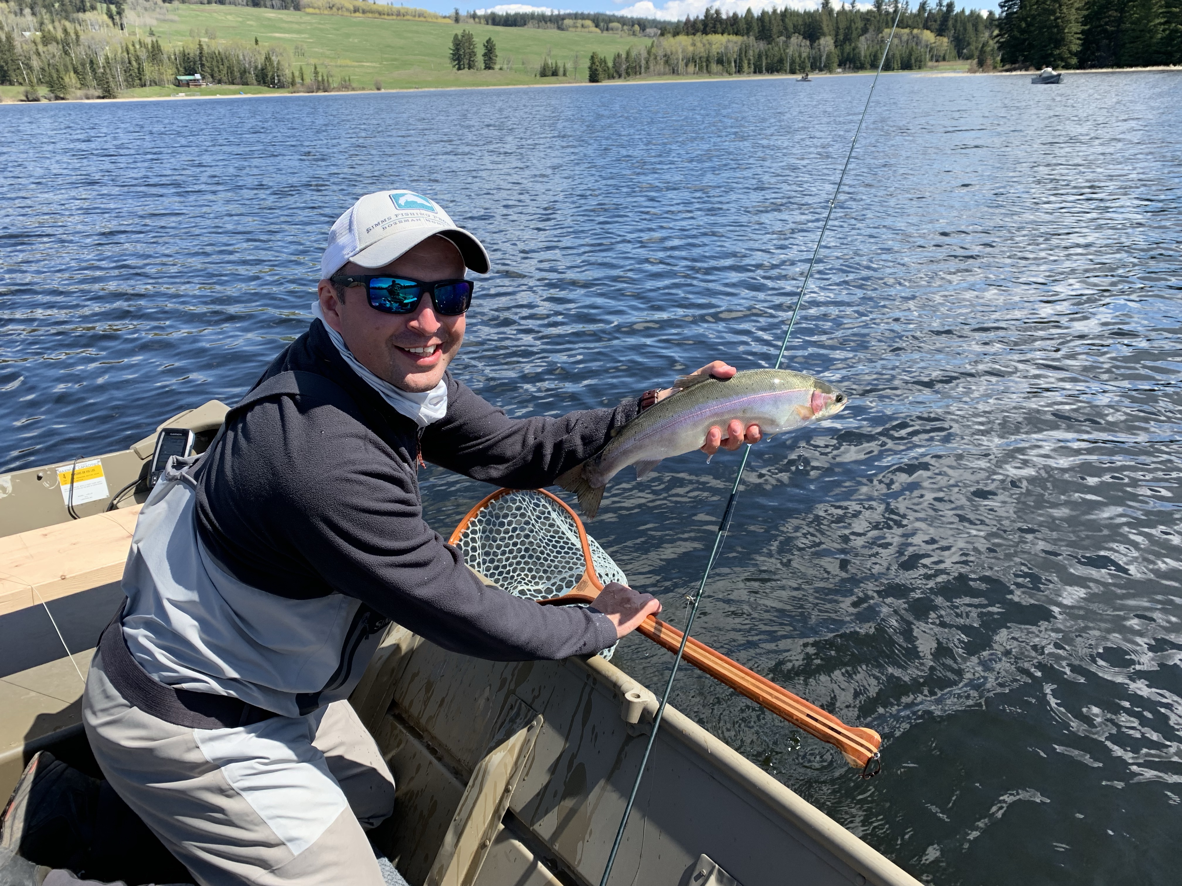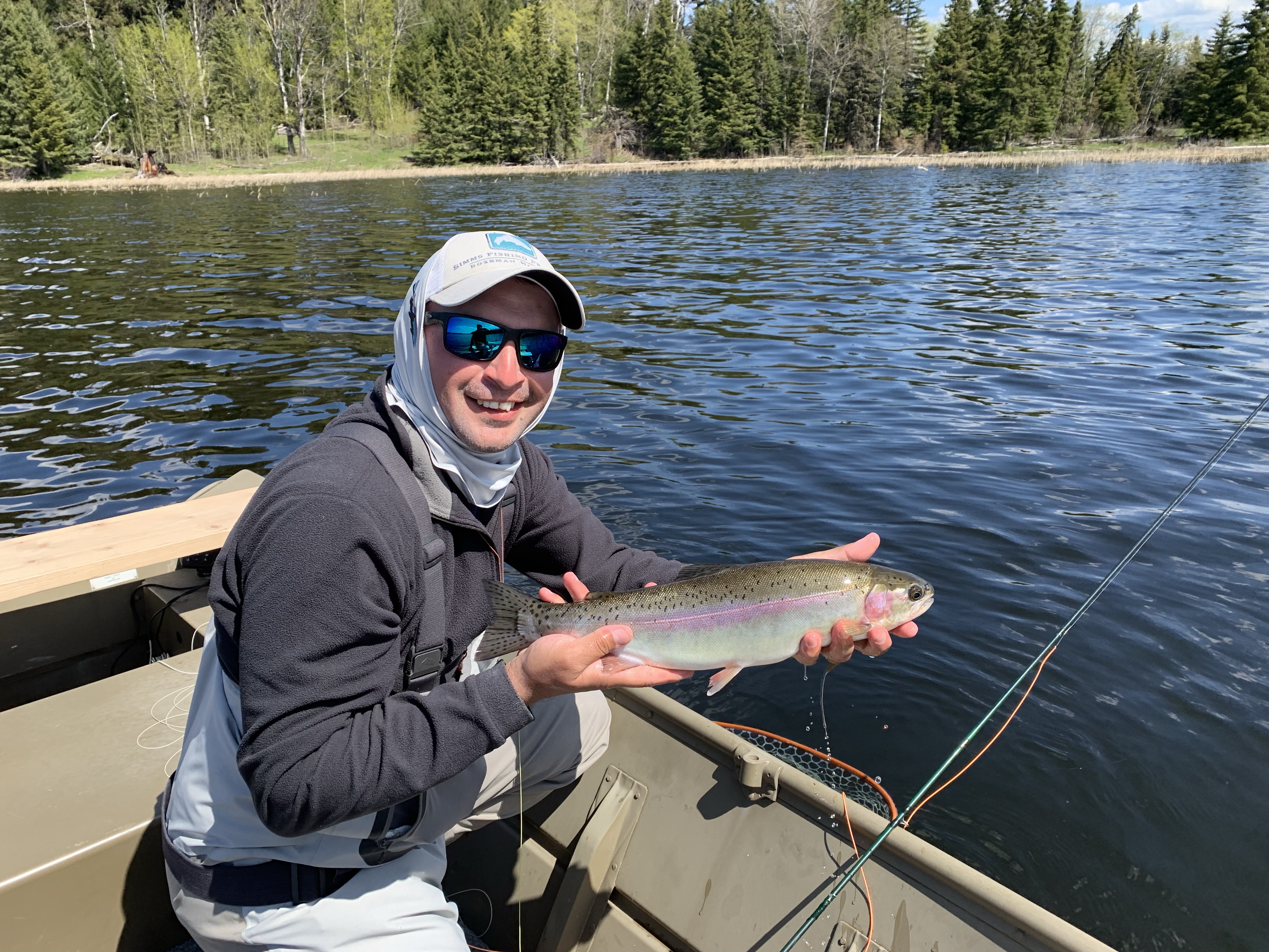 Falling in lake story- so as u can see there are big fish in these lakes. While chironomiding with my new custom Able and new linear 10/4 rod I took a break to do something and put my rod between my legs. Just as I did I feel my rod move and all of a sudden I see my rod in the air! With my cat like reflexes I went to grab my rod with one hand in gunnel and one leg bracing myself under the non secured seat. In a flash I feel my self summersaulting off the seat and rolling right into the lake. While in the lake and holding on to the boat I have to make a quick decision to swim for bobbing rod or get back into the boat. Since I was wearing waders I decided to get back into the boat. For about five minutes we see the fish jumping with the line and rod still attached and it looks to be a 3-4 lb rainbow. After removing my wet clothes I come to the realization that my set up is gone. Fifteen minutes later a guy yells he found a rod as it was bobbing by his boat. Thinking it was his rod because he had the same rod he grabs it and plays the fish that is still hooked.