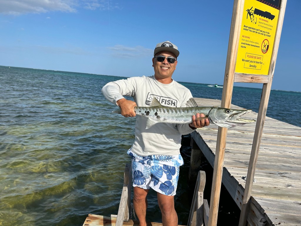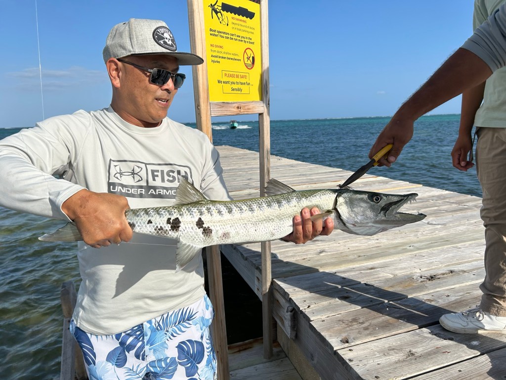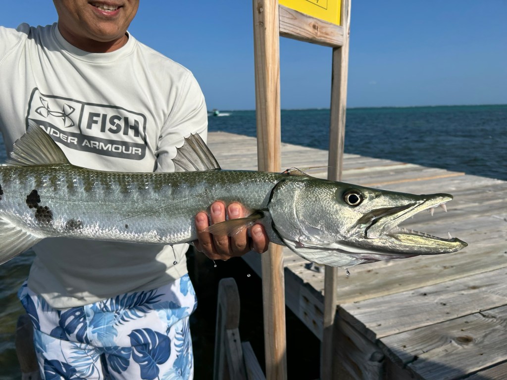 Following the bike ride I decided to make a few casts with my fly rod. The first few casts I attracted some permit but couldn’t get them to take the fly. I also saw some bones. One cast attracted something big out of the grass but it didn’t take. As I cast in front of the fish I just attracted I was able to hook into it only to find out it was a decent barracuda. Almost taking all my line twice including backing I was able to land this beauty which I ended up giving to a local. After the fact found out the bar down the road will cook it up for me.