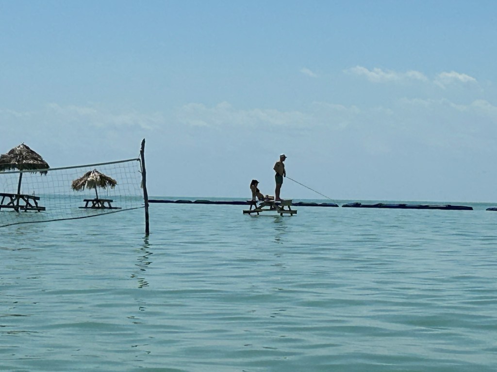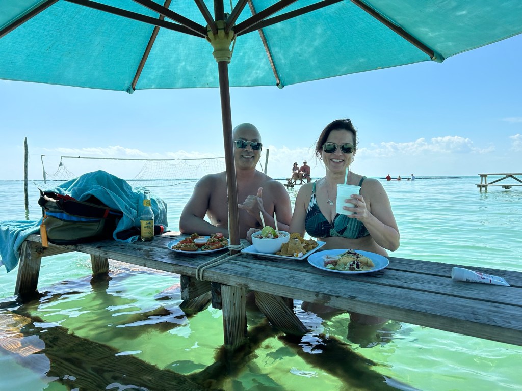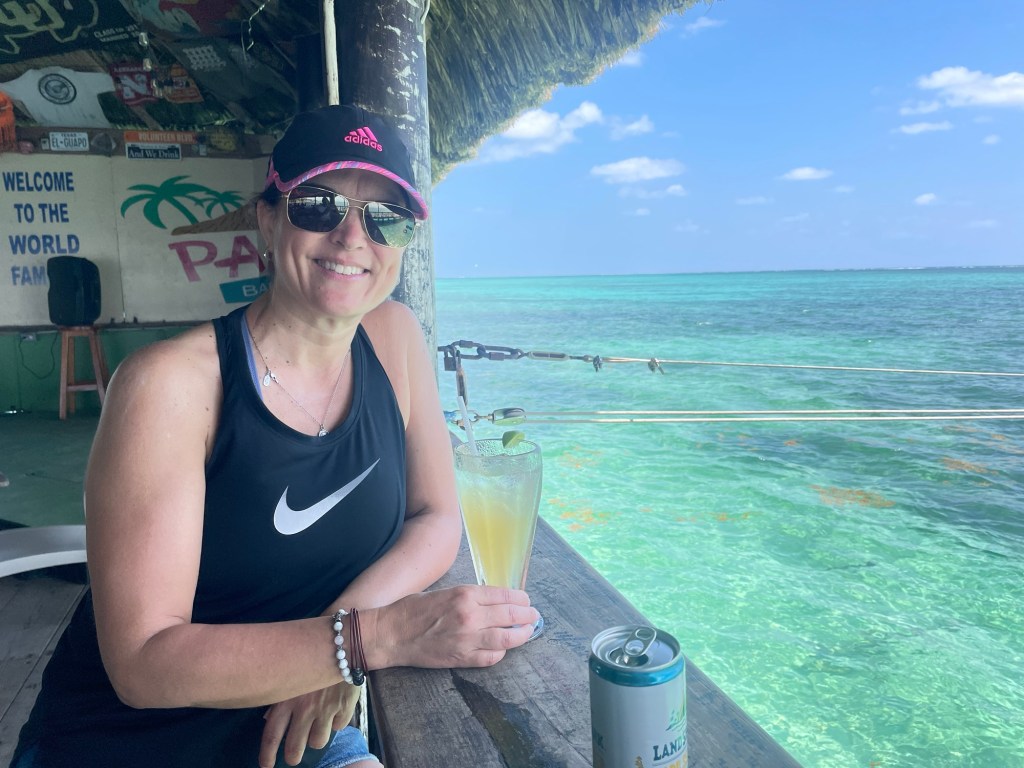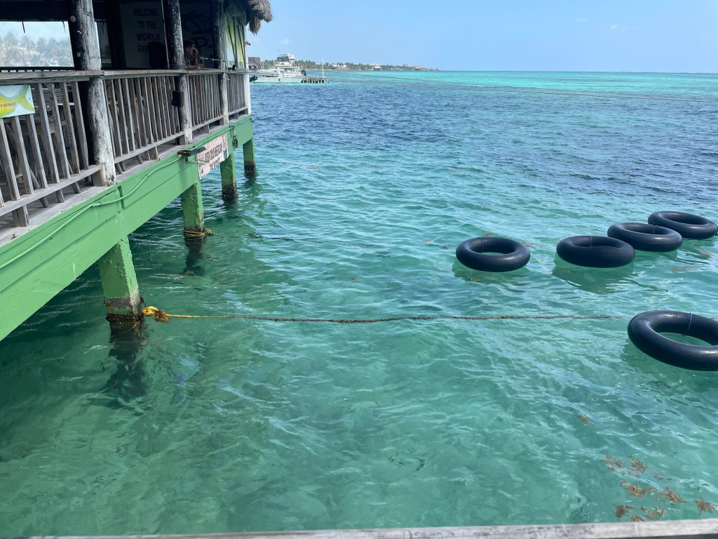 22 03 2025On our second full day we decided to take advantage of the resort bikes and ride to San Pedro which was just over a ten km ride. In most hot places this would be torture but Belize has a instant wind which kept us somewhat cooler but I won’t lie….my 54 year old body felt it. Arriving in San Pedro we immediately found a cool bar called Palapa which was situated on the water. As we walk up to the bar my eyes bug wide open as I see some fish under the pier and then start to freak out as I realize they are tarpon!