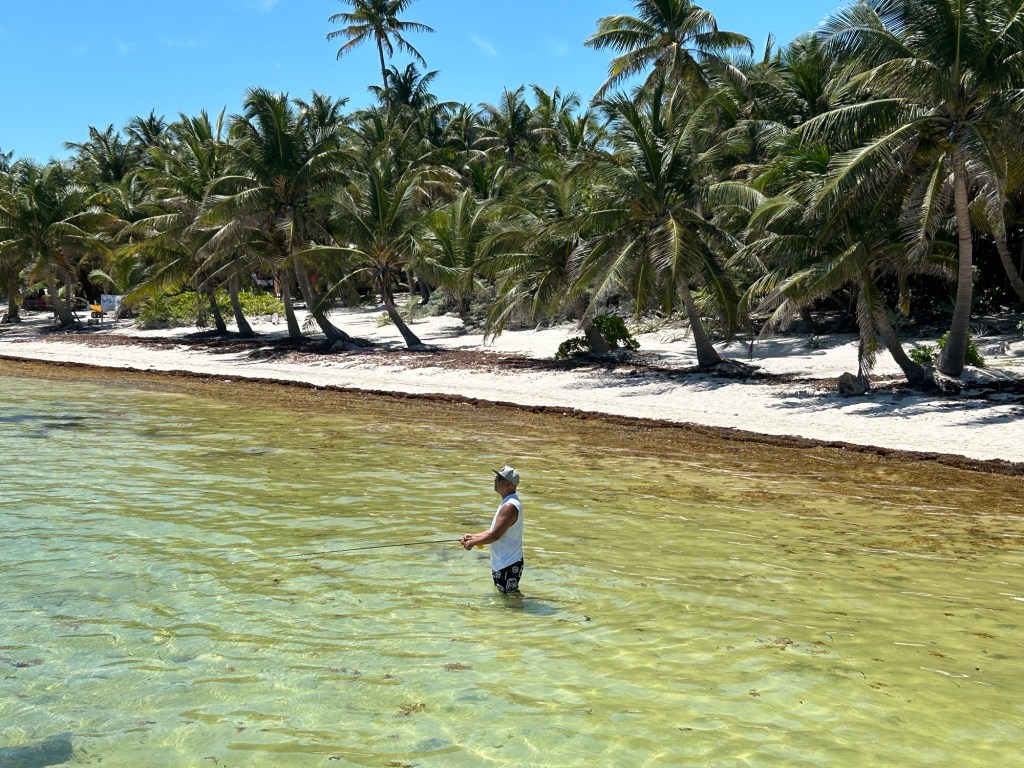 22 03 2025Day five was kind of a free day. We had no real plans so decided to explore the north and venture out on the golf cart about one hour north through jungle and dirt and beach roads. This adventure took us to Tranquility Bay which was a super pleasant surprise. On the way there we watched fly fishing guides fishing the flats and was very disappointed with the amount of garbage, mostly plastics, washed up on the beach. Arriving at Tranquility beach was like no other beach I have seen. Palm trees lining the shoreline, reef break off shore and crystal clear waters in turquoise for as far as the eye can see.