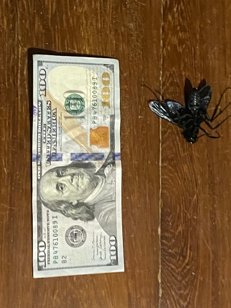 Later that night as I was opening the door to the hut, just as I turned the door handle, Rebeca screams out like she had been shot. As she stumbles into the hut I notice a winged bug or small bat coming in with her. As she takes cover in the bed I grabbed my food rod case and immediately started using my kendo skills to kill whatever was in our room. I also realize that Rebeca had been stung and this monster three inch black winged thing was a huge wasp. Seriously after three good strikes I was able to somewhat stun it but only stun it as it was still alive. Worried it was poisonous I ran to the front desk to get help.