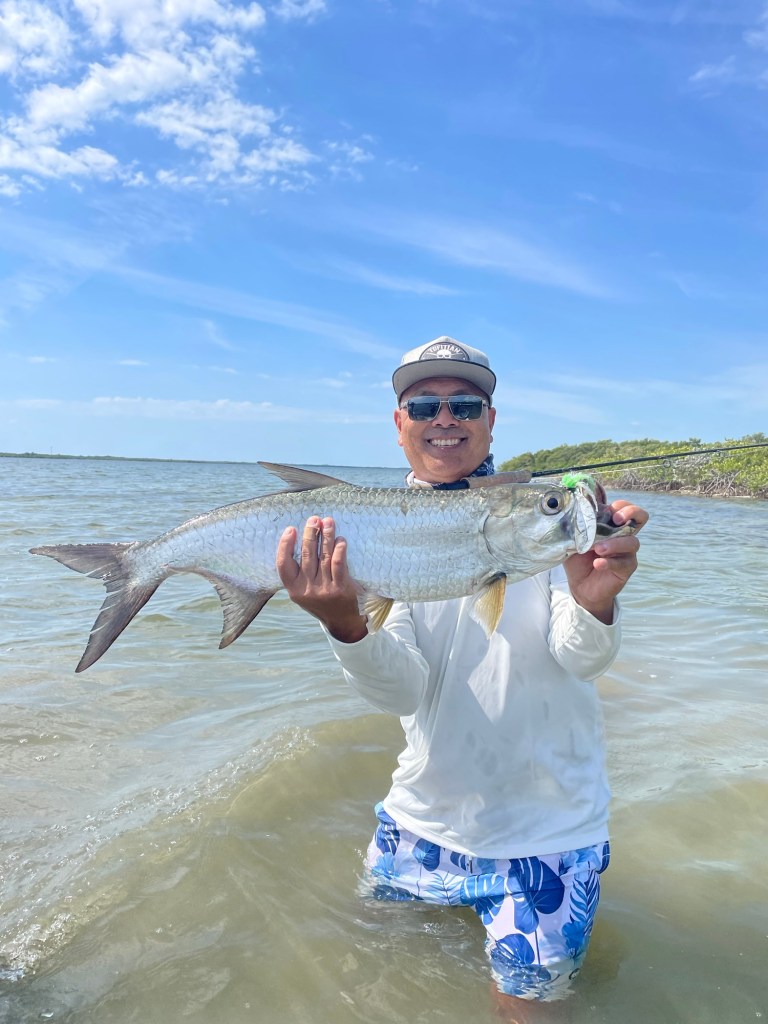 I turn to him and say I was just too excited! I saw the tarpon come out of the water to hit this bait fish pattern that was just inches below and it was just too fucking exciting. The guide responds…I know , I know. He tells me the story of bowing down to the gods in order to catch tarpon , in reference to keeping the tip down. We see more risers but no luck and we decide to move to another bay. As soon as we arrive at the other bay it was game on again. We see moving fish and he tells me to shoot a cast to the fishing moving right but fifteen feet ahead of the fish. I am on it…until the wind picks up and in my excitement I make a high cast and my fly floats down in a pile of line like I have never casted before. Darrell starts swearing and telling me to re cast. But we miss the fish. Of course he proceeds to tell me to cast lower so the wind doesn’t catch the fly. I respond by thanking him for the tips and he turns and starts telling me to cast left to fish now moving left to right. I make a few casts to these fish which are now moving towards us and one takes…..except again in my excitement I pull the rod up instead of keeping top down and pulling the line back like I was instructed. Well….that was it. The guide went ape shit crazy telling me I don’t listen and I just do me. Now some people might take offence but everything he is mad about just made me more focussed to do better. He made a lot of sense. I again tell him this is hard. When u see a tarpon chasing your fly and this is all being done just meters away from the boat in clear water …one can’t help but get excited. Darrell calms down and within seconds shouting out commands again. I see the fish, I shoot the line when he instructed me to start stripping 25 inch constant and smooth retrieves , he yells it’s going to strike and this time I pull my retrieving hand back feeling the weight of the fish, give it a second yank and it’s game on! This fish pulls line out like there is no tomorrow, darrell continues to shout out commands like keep your tip down….and if the fish moves right rod goes left and vice versa. The fight goes on and on but at one point starts darting towards us. Unfortunately I reel with my right but this reel was a lefty and at one point I thought I was going to lose the fish as it darted towards me followed with a jump. Eventually the fish tires and we land a decent juvenile tarpon. What an amazing fish! So strong and majestic.